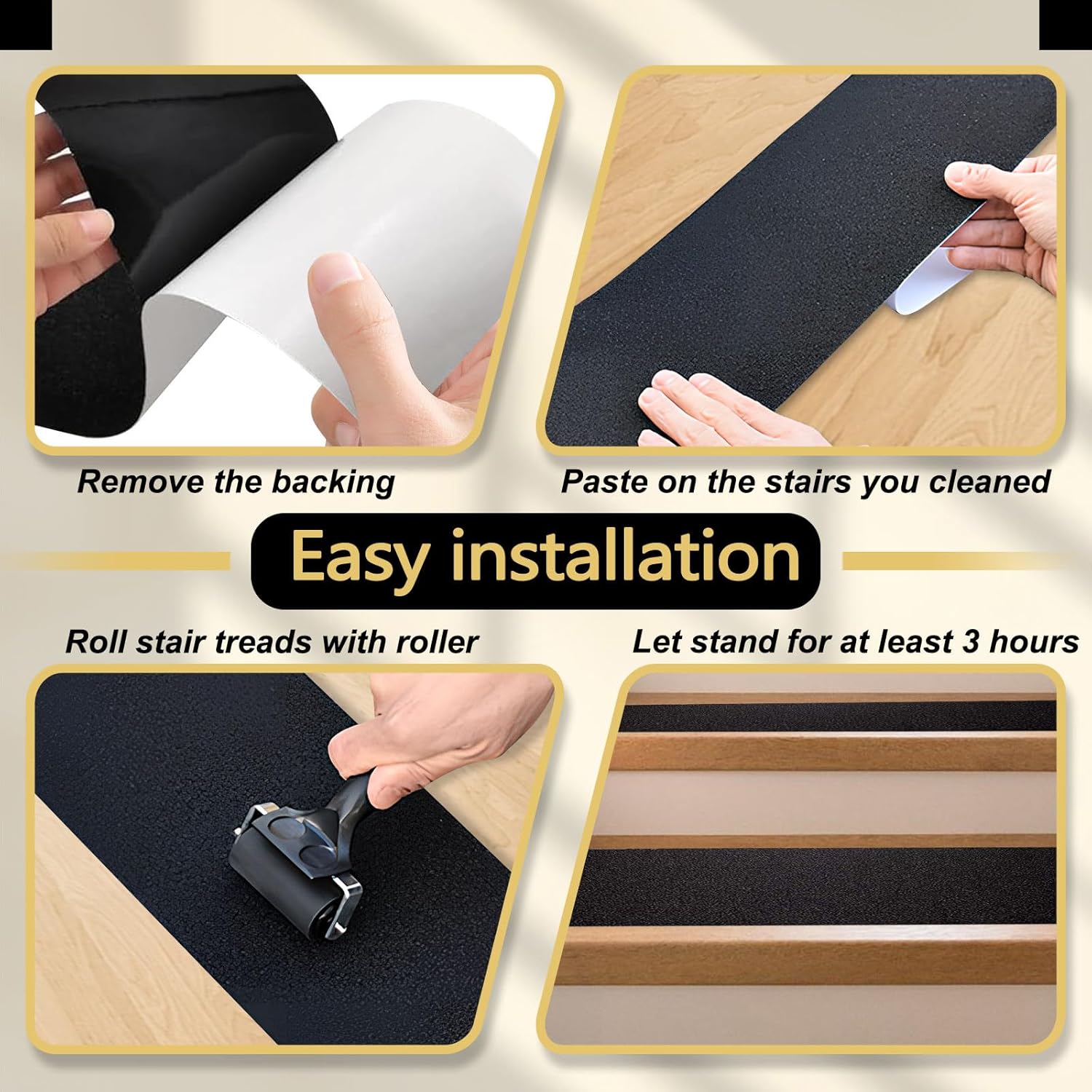 16 Pack Non-Slip Stair Treads, 4" x 42" Anti Slip Resistant Stairs Tread Grip Tape, for Kids Elders and Pets, Pre-Applied Adhesive with Roller-Black